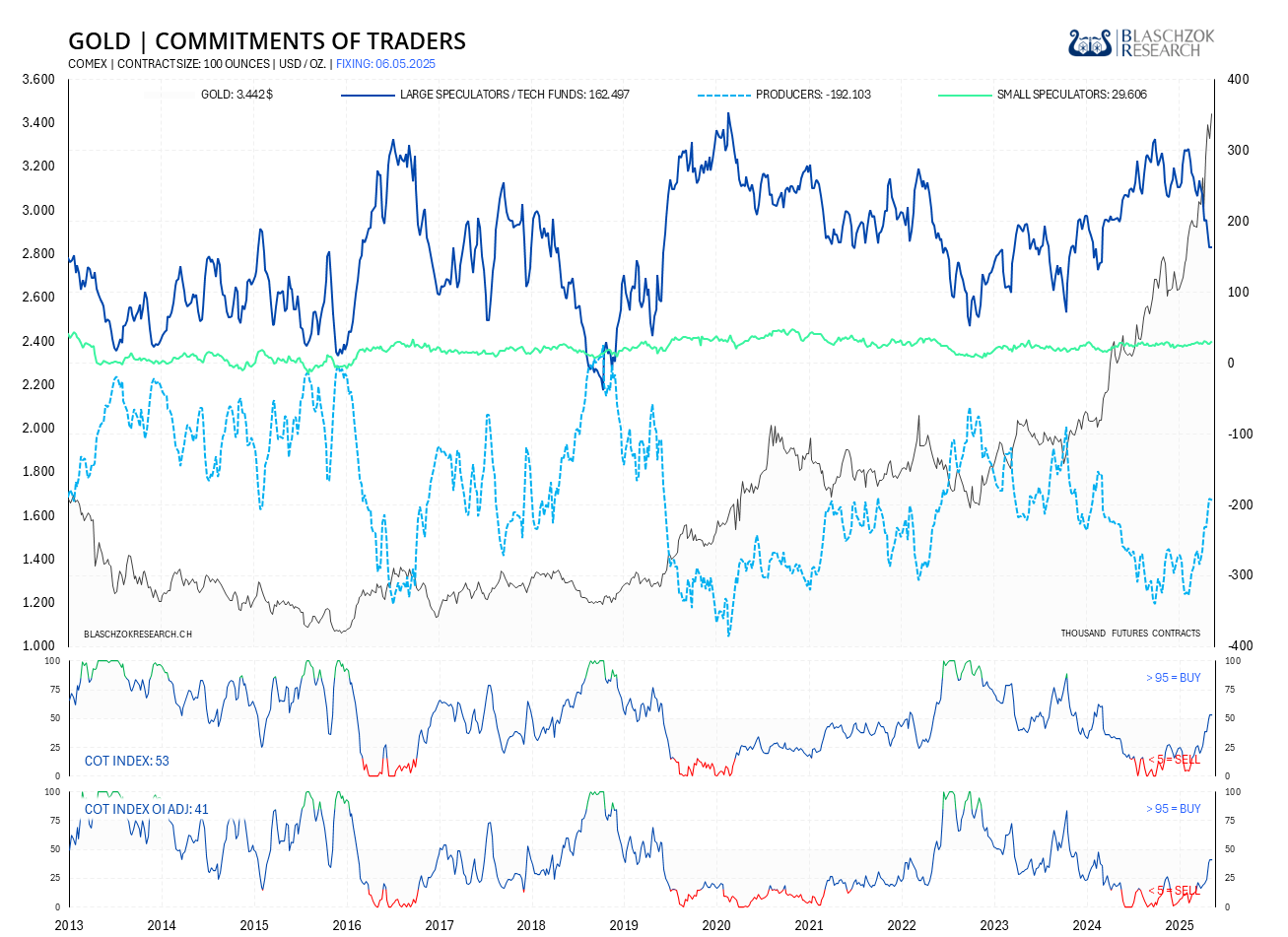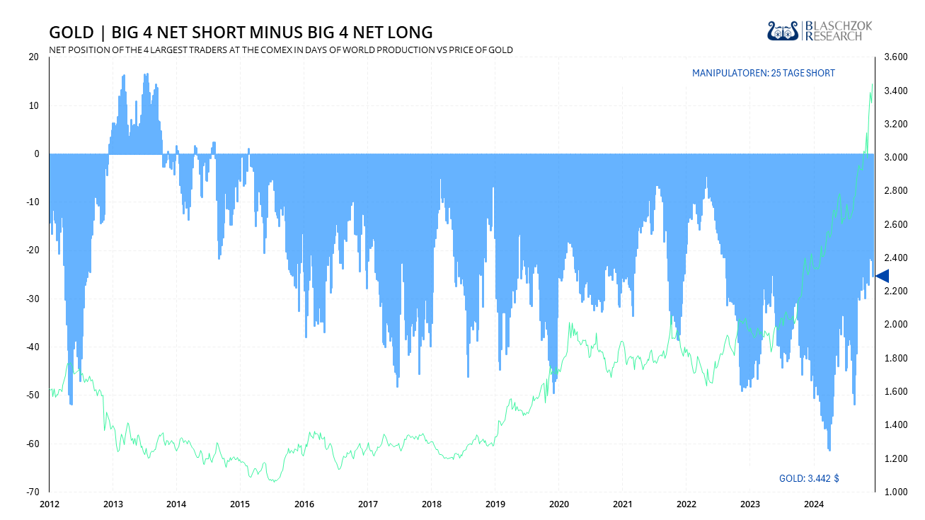 In dieser Korrektur hat sich der Terminmarkt inzwischen bereits zur Hälfte von seiner bullischen Spekulation bereinigt, was unterstreicht, dass ein Goldpreis um die 3.000 US-Dollar mittelfristig nachhaltig sein wird. Ein kurzer Rücksetzer unter den Aufwärtstrend und unter die psychologisch und charttechnisch wichtige Marke von 3.000 US-Dollar je Feinunze würde das bullische Momentum weiter zerschlagen. Es ist daher gut möglich, dass Regierungen ein solches Szenario anstreben. Im Trading rechnen wir aktuell damit.