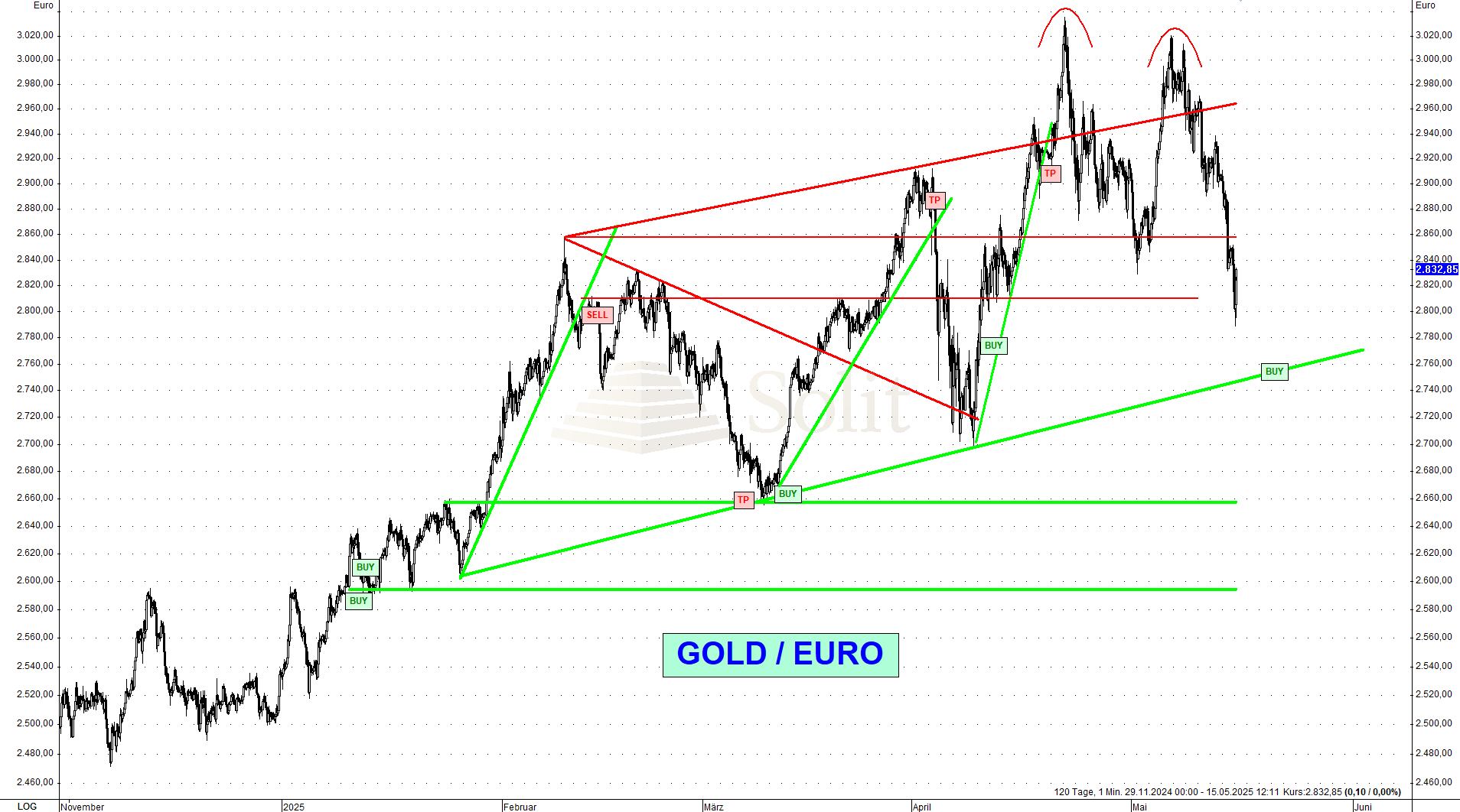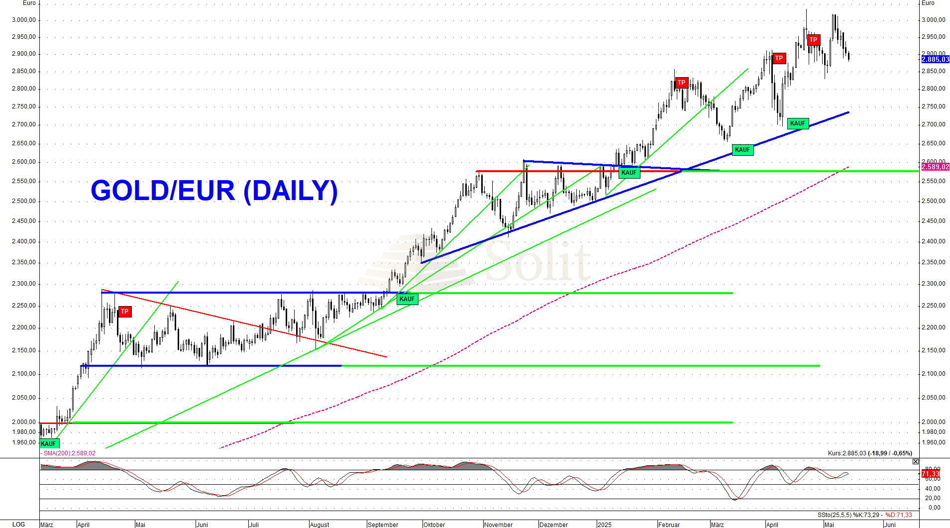 Den Goldpreis in Euro haben wir seit Jahresbeginn nahezu perfekt gehandelt. Der Ausbruch Anfang 2025 bei 2.600 Euro wurde gekauft, Gewinne wurden Anfang Februar bei 2.800 Euro realisiert. Anschließend handelten wir die Korrektur bis 2.660 Euro, die wir erneut für Käufe nutzten. Zuletzt wurden bei 2.880 Euro die Gewinne erneut mitgenommen. Premium-Abonnenten von www.blaschzokresearch.ch konnten diese Trades gemeinsam mit uns direkt umsetzen.