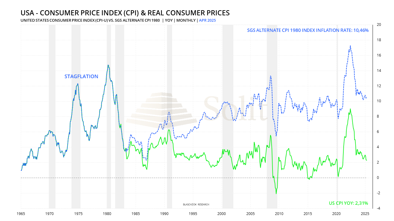 Allerdings zeichnen alternative Berechnungen, wie sie beispielsweise von ShadowStats veröffentlicht werden, ein deutlich anderes Bild. Würde das Bureau of Labor Statistics (BLS) den Verbraucherpreisindex weiterhin nach der Methodologie berechnen, die noch unter Fed-Chef Paul Volcker – also vor den umfassenden Reformen der 1980er und 1990er Jahre – Anwendung fand, läge die Teuerungsrate für April 2025 bei rund 10,4 % und damit weit über dem Anstieg des Verbraucherpreisindex.