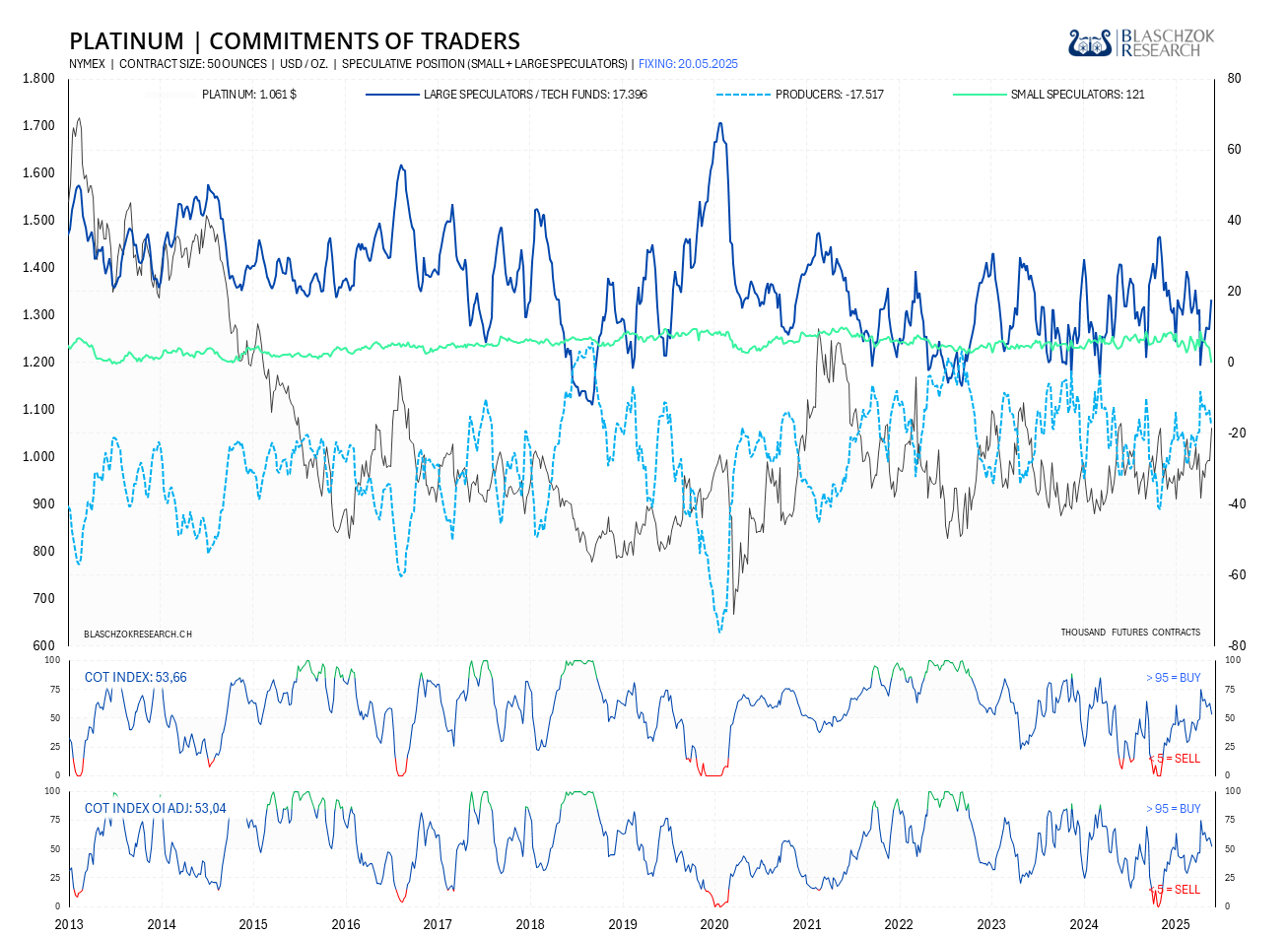 Nun brach im Zuge des Zollstreits der Platinpreis kurzzeitig nach unten aus seiner engen Handelsspanne aus. Dieser Rücksetzer wurde jedoch schnell zurückgekauft und so kam es zu Shorteindeckungen, die den Preis nun über seinen Abwärtstrend auf 1.100$ hoben. Der Ausbruch gab nun den Spekulanten ein Kaufsignal, wobei der Preis nun auf 1.250$ bis zu 1.300$ ansteigen könnte. Aktuell wird der Preisanstieg über die Spekulanten am Terminmarkt getrieben, was der neueste COT-Report zeigt. Für die Stärke innerhalb der Handelsspanne war zuletzt ein Defizit am physischen Markt verantwortlich, dessen Ursprung in gestiegener physischen Schmucknachfrage aus Asien liegen dürfte.