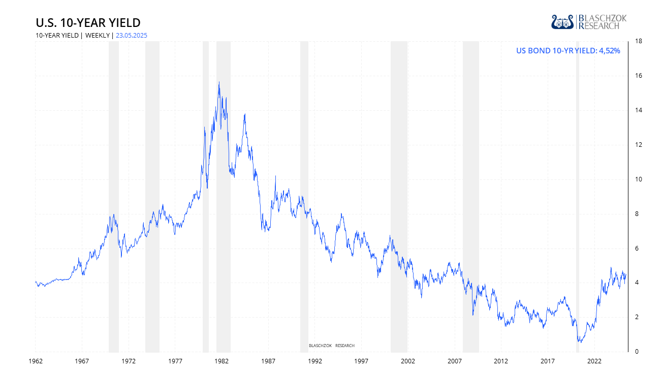 Die Zinsen für zehnjährige US-Staatsanleihen konsolidieren weiterhin auf hohem Niveau, trotz der Zinssenkungen durch die Fed. Dies hatte ich bereits vor über einem Jahr prognostiziert. Die Herabstufung der USA durch Moody’s befeuert diese Entwicklung nun zusätzlich. Jahrzehntelang steigende US-Schulden und anhaltende Defizite führten nun zu diesem Ergebnis, wobei das Sentiment aktuell extrem bärisch ist, wie die Terminmarktdaten für den USD-Index zeigen. Der Markt glaubt, durch die Herabstufung würde eine künftige geldpolitische Lockerung der Fed wahrscheinlicher werden, dies den US-Dollar unter Druck setzen und diametral gegensätzlich den Goldpreis weiter nach oben schieben. Diese Sichtweise ist kritisch zu hinterfragen, denn die US-Notenbank (Fed) hat sich durch die QE-Programme seit 2008 in die Ecke gepinselt und ihr fehlen die Optionen.