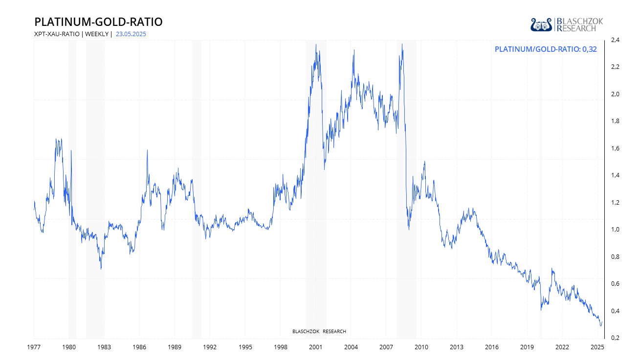 Ein wichtiger Faktor ist die Veränderung im Konsumverhalten. Angesichts historisch hoher Goldpreise orientieren sich chinesische Verbraucher zunehmend in Richtung Platin. Dieser Trend zeigt sich bereits deutlich im Schmuckbereich sowie bei Münzen und Barren. Vergleicht man die Performance der vergangenen Dekade, zeigt sich, dass Platin gegenüber Gold und Silber deutlich underperformt hat. Seit 2014 fiel der Platinpreis um rund 6 Prozent, während Gold um 175 Prozent und Silber um 97 Prozent zulegten. Erste Anzeichen einer Bodenbildung sind jedoch erkennbar. Die derzeitige Platin-Gold-Ratio von 0,32 (gegenüber etwa 1 vor zehn Jahren und 2 vor zwanzig Jahren) zeigt, dass Platin aktuell historisch günstig zu Gold ist. Langfristig könnte es zu einer Rückkehr zum Mittelwert im Bereich eines 1:1 Verhältnisses kommen, was ein signifikantes Aufholpotenzial für Platin darstellen würde.