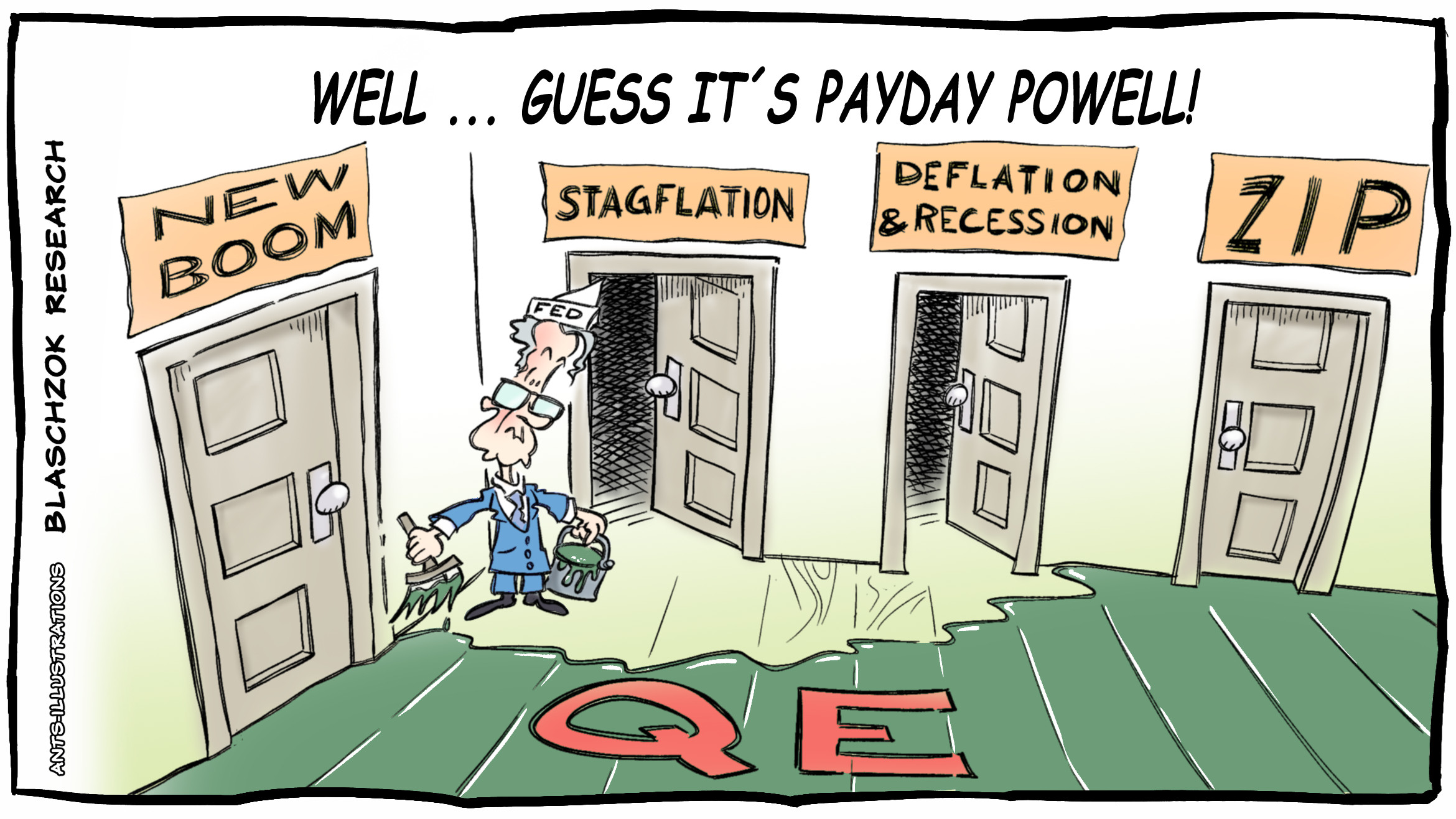 Die FED hat sich damit in eine Situation gebracht, in der sie keine wirksamen Mittel mehr hat. Tut sie nichts, kommt es zu einer Kontraktion der Kreditgeldmenge und damit zu einer Rezession, in der sich die US-Wirtschaft der marktwirtschaftlichen Realität stellen und anpassen muss, um international wieder wettbewerbsfähig zu werden. Greift die Fed hingegen ein, um eine Geldmengenkontraktion bzw. eine Deflation zu verhindern, steigen die Inflation und die Marktzinsen, was ebenfalls in einer Rezession in Form einer Stagflation mündet. Mit anderen Worten: Die Rezession ist unausweichlich, die Asset- und Anleihenmärkte stehen zunehmend unter Druck und die FED hat keine Optionen mehr, um das Ruder herumzureißen. Die Konsequenzen der bisherigen Politik sind unausweichlich und die FED kann nur noch zusehen, wie sich die Lage entfaltet. Die US-Notenbank hat sich in eine Ecke gepinselt. Jetzt ist Zahltag.