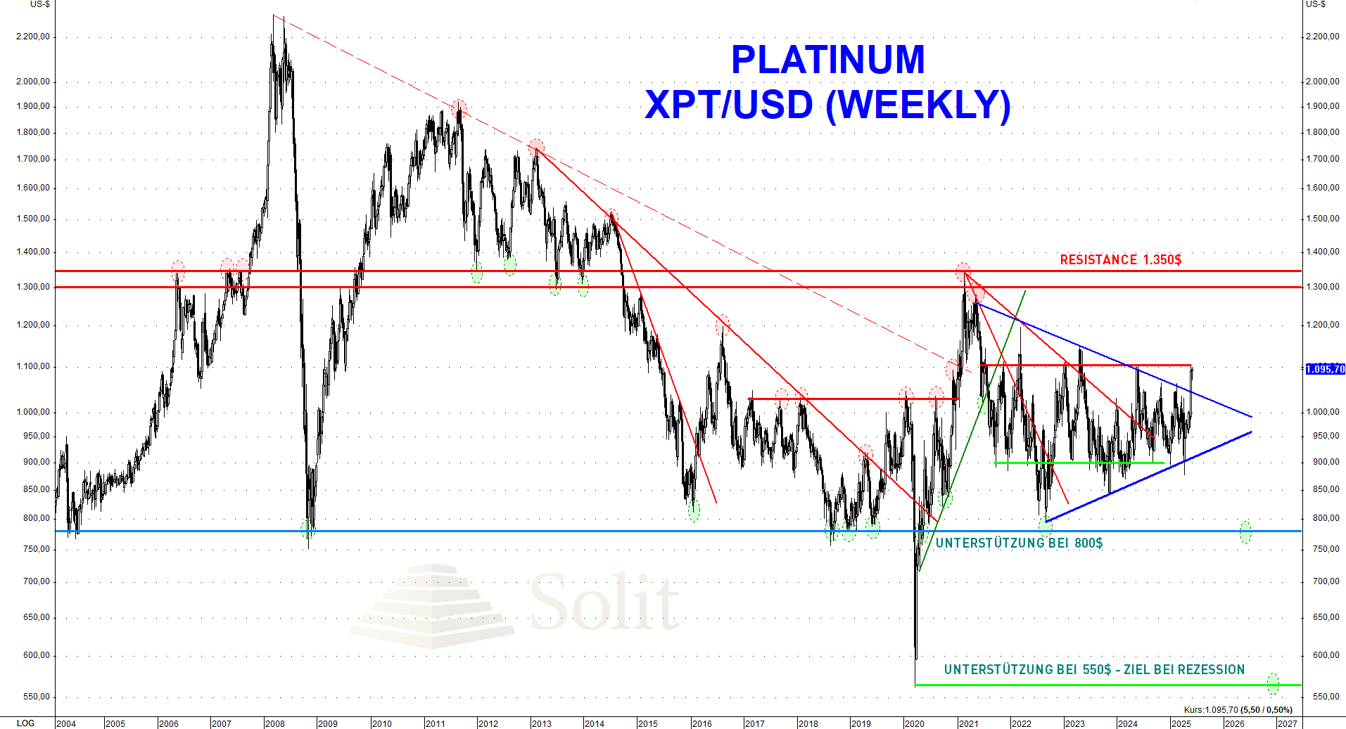 Platin könnte langfristig im Bereich zwischen 800 und 500 US-Dollar eine stabile Unterstützungszone ausbilden. Für Anleger mit einem mittel- bis langfristigen Anlagehorizont bieten Rücksetzer in diese Region attraktive Einstiegschancen. Historische Daten zeigen, dass Rezessionen häufig mit abrupten, kurzfristigen Einbrüchen bei den Preisen von Platin und Palladium einhergehen. Sollte der Platinpreis in einer Rezession auf 600 US-Dollar fallen, wäre dies eine sehr interessante Gelegenheit für antizyklische Käufe.