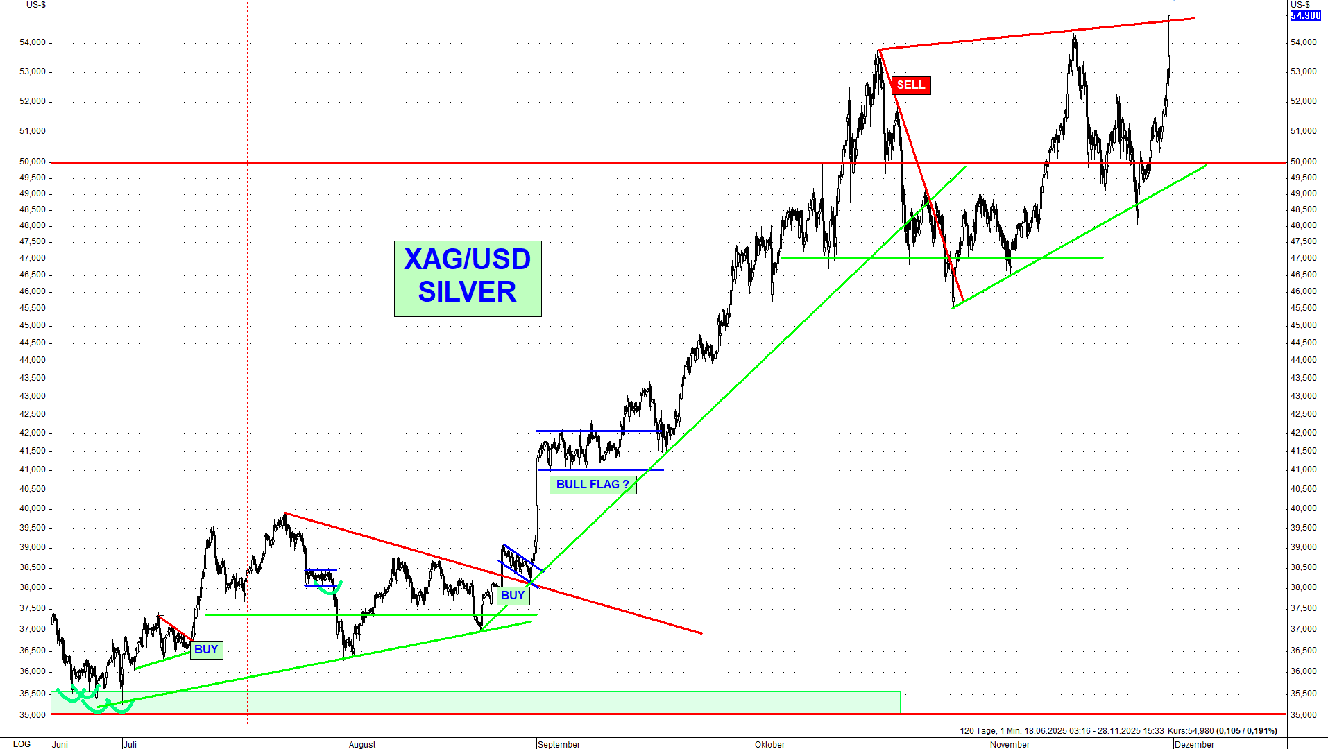 Die Störung wirkte sich auch auf verbundene Börsen wie CBOT, NYMEX, COMEX und weitere Märkte aus und traf die Marktteilnehmer mitten im Rollprozess laufender Terminkontrakte, sodass Positionen faktisch eingefroren wurden. Eine der wichtigsten Liquiditätsquellen des Marktes fehlte, was im Falle exogener Schocks die Gefahr überproportionaler Kursausschläge erhöhte. Die CME hat am Freitagnachmittag den Handel wieder aufgenommen, worauf Gold und Silber kurzzeitig nach oben schossen und der Silberpreis ein neues Allzeithoch bei 55,26$ erreichte. Diese Volatilität im dünnen Feiertagshandel sollte man jedoch nicht überbewerten und sich bewusst sein, dass Gold und Silber nächste Woche durchaus wieder unter ihre wichtigen Widerstände fallen können, wenn die Marktteilnehmer nach dem Feiertagswochenende an ihre Handelstische zurückkehren. Aktuell sind Gold und Silber Long über ihren Widerständen, wobei man einen engen Stop-Loss platzieren sollte, falls der Ausbruch nicht nachhaltig ist.