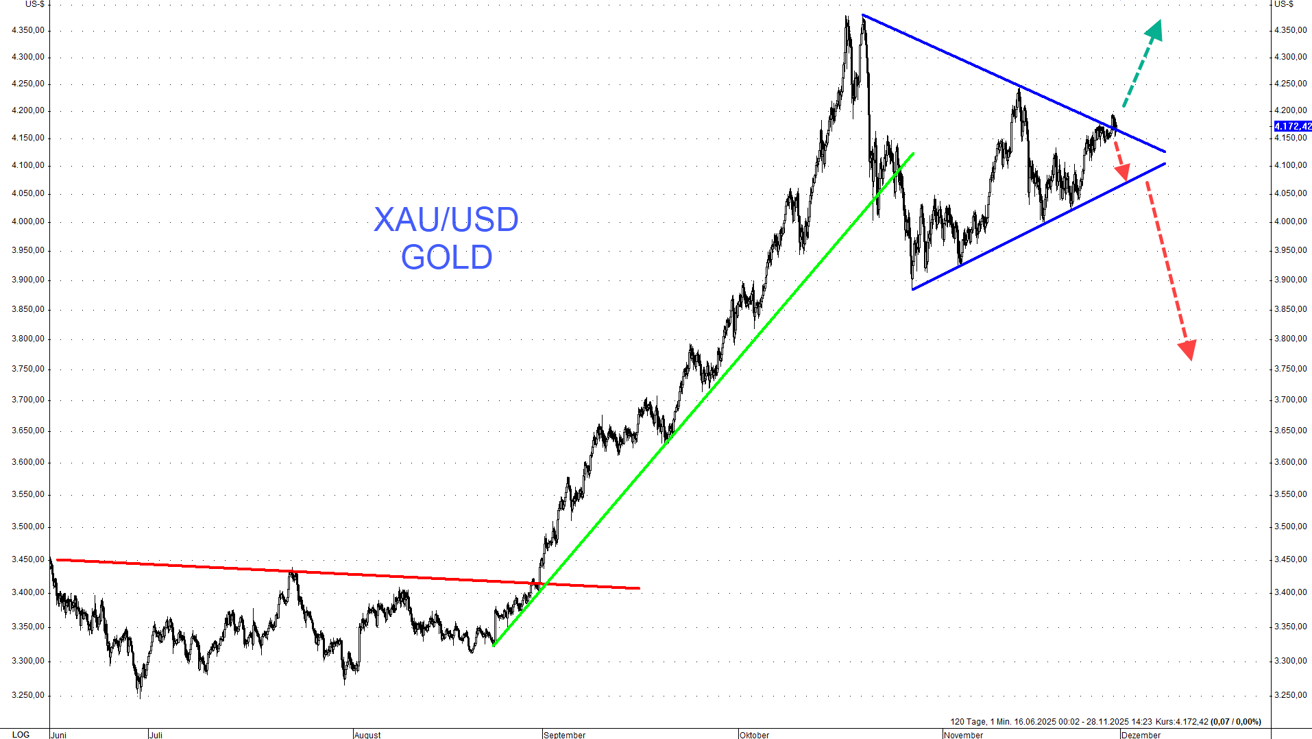 Gold und Silber handeln derzeit an äußerst wichtigen technischen Marken, die maßgeblich für die Kursrichtung der kommenden Wochen und Monate sind. Der Goldpreis hatte sich in den vergangenen Wochen charttechnisch in eine immer engere Handelsspanne eingekeilt, sodass ein Bruch des Abwärtstrends im Bereich von etwa 4.175$ Short-Eindeckungen und neue spekulative Käufe nach sich ziehen würde. In der Folge wäre ein Sprung an das Allzeithoch im Bereich von rund 4.400$ möglich. In diesem Szenario dürfte der Silberpreis, der aktuell bereits sein Allzeithoch testet, weiter anziehen, wobei ein Short-Squeeze hier einen ausgeprägten Preissprung auslösen könnte.