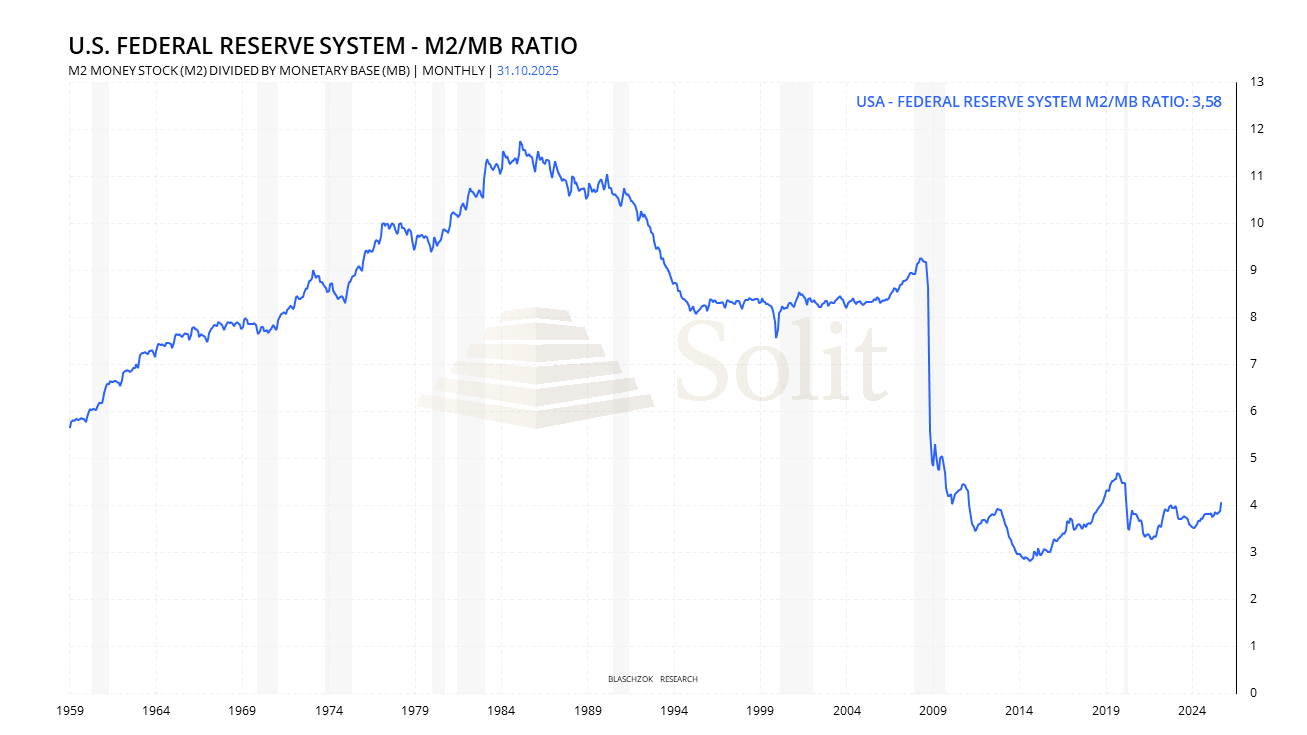 Heute entstehen erneut große Vermögensblasen, doch da die Notenbanken die Liquidität steuern, ist unklar, wie und wann diese Blasen platzen werden. Die Fed ist mit den aktuell extrem hohen Bewertungen am Aktienmarkt keineswegs zufrieden, weiß jedoch, dass eine Normalisierung der Bewertungen und ein umfassendes De-Risking erhebliche wirtschaftliche Verwerfungen auslösen könnten. Betrachtet man die Geldbasis im Verhältnis zur Geldmenge M2, zeigt sich, dass das Kreditgeldsystem heute deutlich weniger stark gehebelt ist als vor zwanzig Jahren. Basel III und die QE-Programme haben das Bankensystem rekapitalisiert, sodass es nun wesentlich robuster dasteht, und die Fed damit etwas mehr Spielraum hätte, bevor sie erneut mit zusätzlicher Liquidität auf eine kommende Krise reagieren müsste.