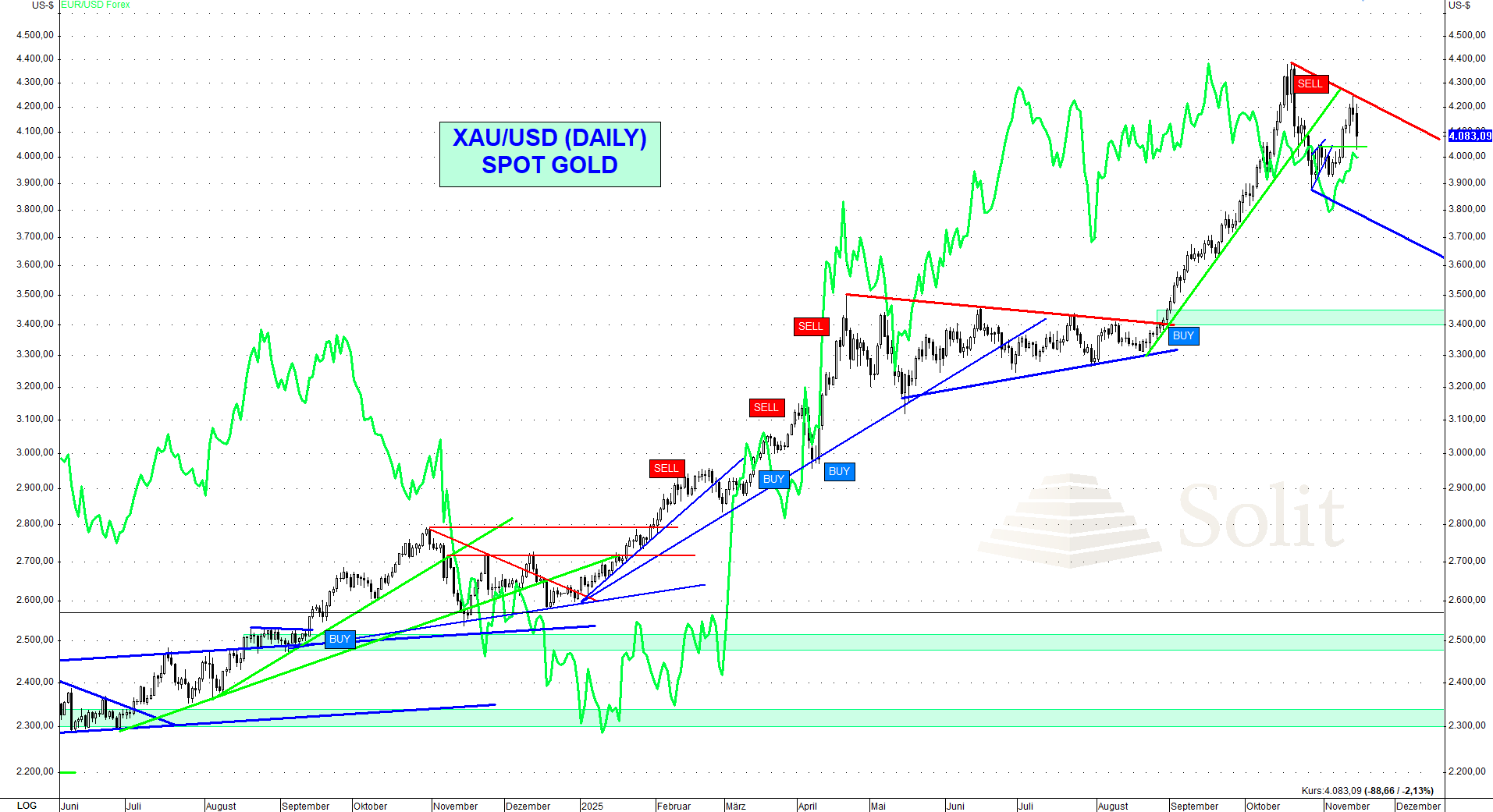 Kurzfristig versuchen wir im Trading weiter zu shorten, mit einem Ziel bei etwa 3.800 $ bis 3.750 $, wo wir im Daytrading alle Short-Positionen schließen würden. Bullisch würde das Chartbild erst wieder werden, wenn es dem Goldpreis gelingt, das Hoch dieser Woche bei 4.250 $ zu überwinden. In diesem Fall dürfte das Allzeithoch bei 4.400 $ angelaufen werden, wo sich schließlich entscheidet, ob sich die Rallye weiter fortsetzt.