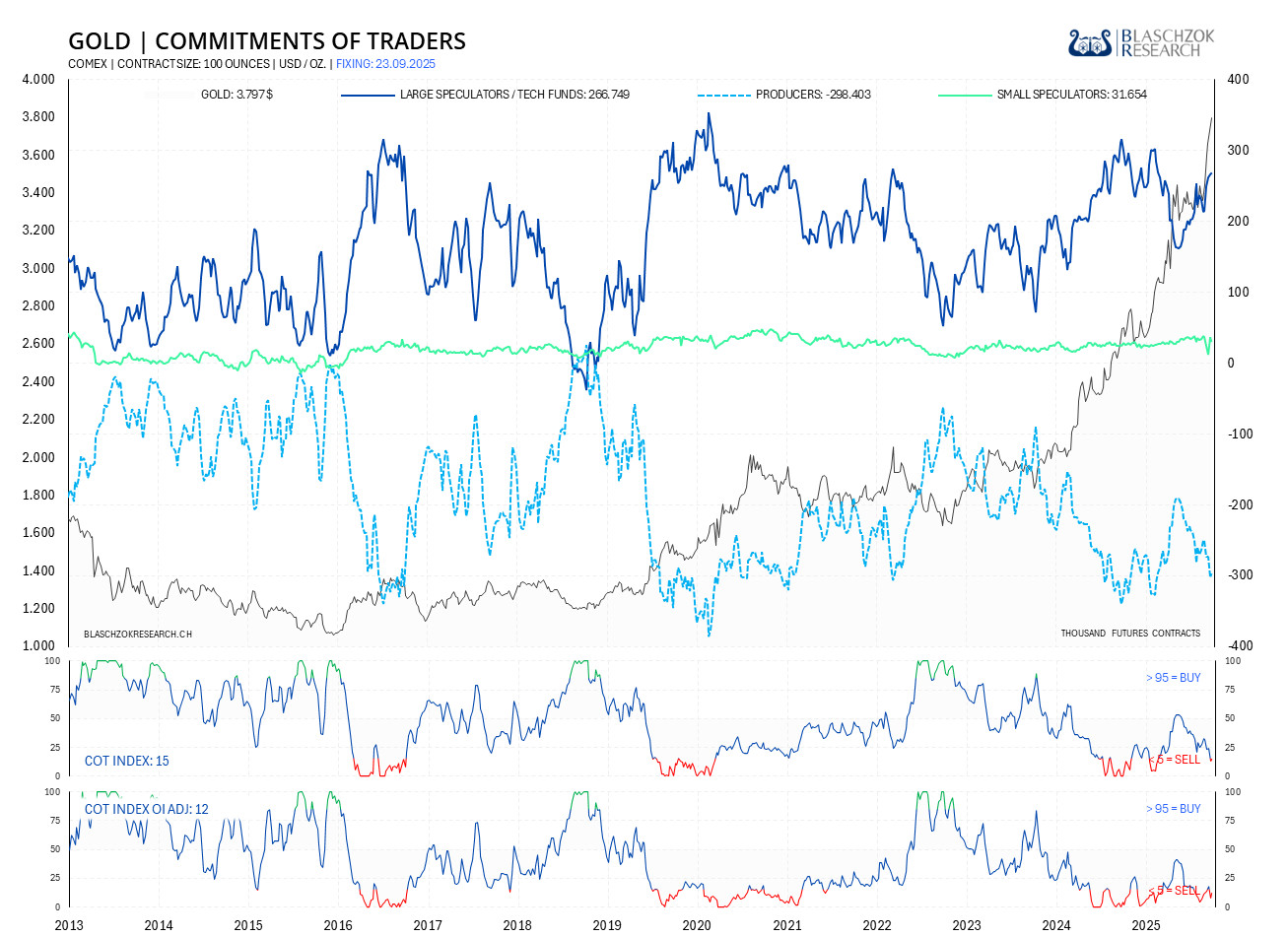 Interessant ist, dass die großen vier Händler am Terminmarkt im letzten Monat ihre Shortposition deutlich ausgeweitet haben – von 21 auf 36 Tage der Weltproduktion. Es scheint, dass man im Bereich um 4.000 $ ein zyklisches Hoch erwartet und dagegen wettet. Sollten die COT-Daten weiterhin Stärke zeigen, muss man davon ausgehen, dass nach einer Konsolidierung auf diesem hohen Niveau über Wochen oder Monate ein weiterer Preisanstieg folgen könnte. Kurzfristig dürfte jedoch bei 4.000 $ zunächst ein Deckel drauf sein und der Goldpreis eher seitwärts handeln - auch wenn dieser COT-Report noch Stärke zeigt. Das Potenzial für einen Long-Drop am Terminmarkt, der für eine stärkere Preiskorrektur sorgt, ist unvermindert gegeben, auch wenn die Daten besser sind als noch vor einem Jahr.