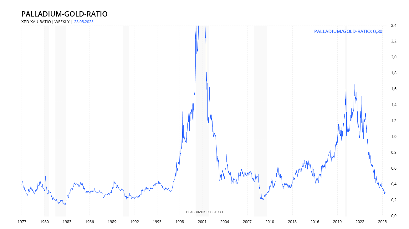 Langfristig bleibt die Marktentwicklung jedoch unklar, da das wachsende Angebot aus dem Recyclingbereich voraussichtlich anhaltenden Einfluss auf den Markt haben wird. Parallel dazu dürfte sich das bereits historisch niedrige Palladium-Gold-Ratio von derzeit 0,33 in den kommenden Jahren weiter verringern – womöglich wird das Ratio auf ein neues Allzeittief fallen.