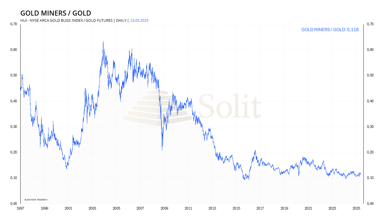 Trotz dieser jüngsten Aufwärtsbewegung bleibt der Sektor im historischen Kontext weiterhin deutlich unterbewertet. Im Verhältnis zum aktuellen Goldpreis notieren Goldminenaktien sogar günstiger als zur Jahrtausendwende.