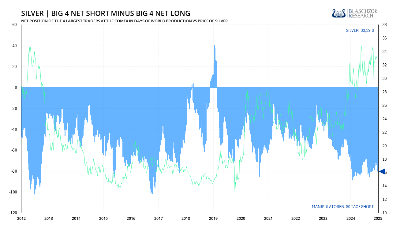 Gelingt dem Silberpreis in diesem Umfeld ein nachhaltiger Ausbruch über den Widerstand bei 35 US-Dollar, wäre eine rasche Rallye in Richtung des Allzeithochs bei 50 US-Dollar durchaus möglich. Sollten zudem die vier größten Händler an der COMEX, die aktuell eine sehr hohe Short-Position im Umfang von rund 80 Tagen der globalen Silberproduktion halten, in einem weiter steigenden Markt gezwungen sein, ihre Positionen einzudecken, wäre sogar eine kurzfristige Verdoppelung des Silberpreises gegenüber dem aktuellen Niveau denkbar.
