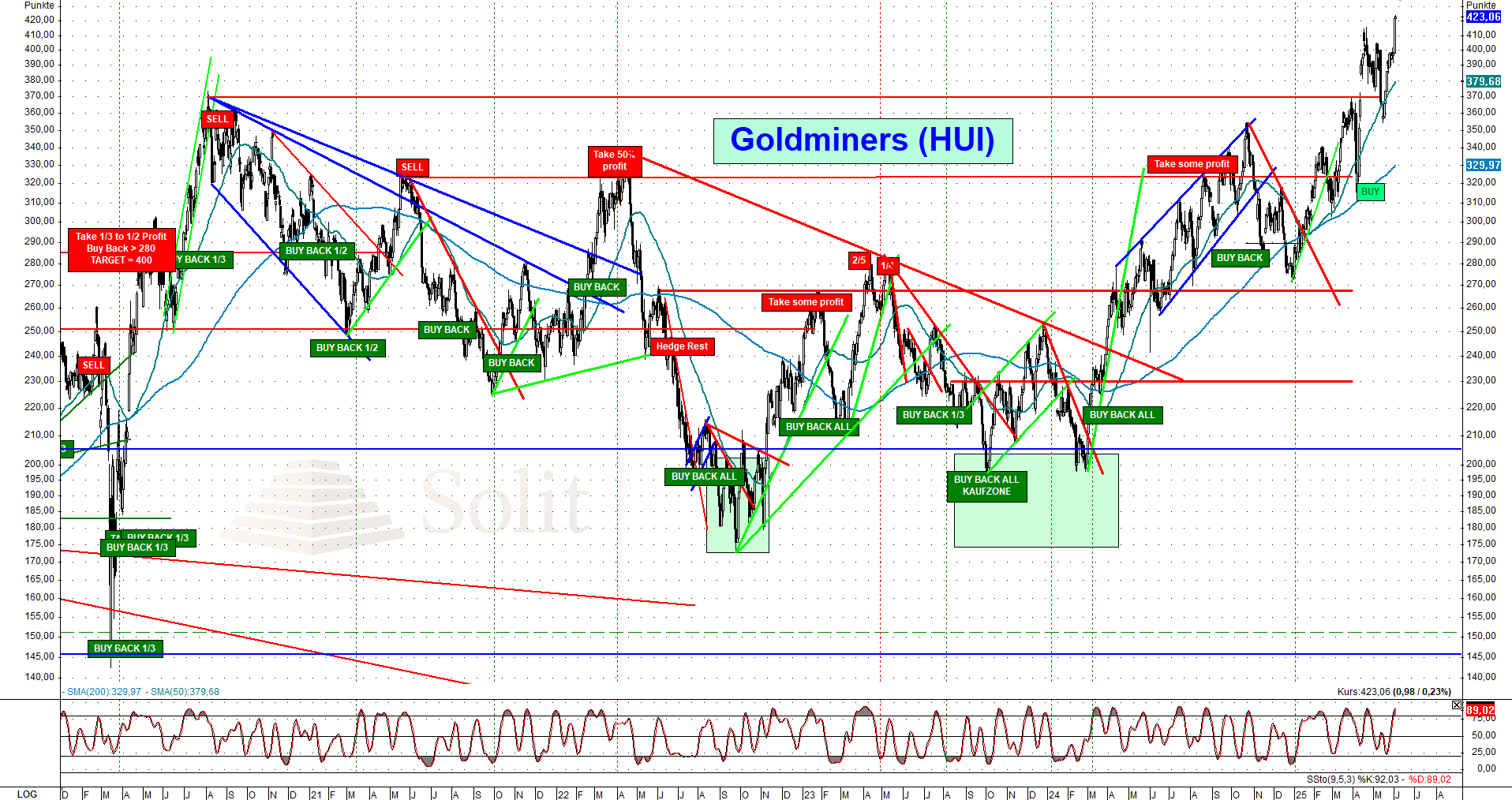 Sollte es dem Goldpreis gelingen, das bisherige Allzeithoch bei 3.500 US-Dollar nachhaltig zu überwinden und in Richtung der psychologisch bedeutsamen Marke von 4.000 US-Dollar vorzustoßen, ist mit einer spürbaren Ausweitung der Kapitalzuflüsse in den Minensektor zu rechnen. In einem solchen Umfeld dürfte der HUI-Index das frühere Allzeithoch bei 640 Punkten schnell erreichen, was einem weiteren Anstiegspotenzial von rund 50 Prozent entspricht.