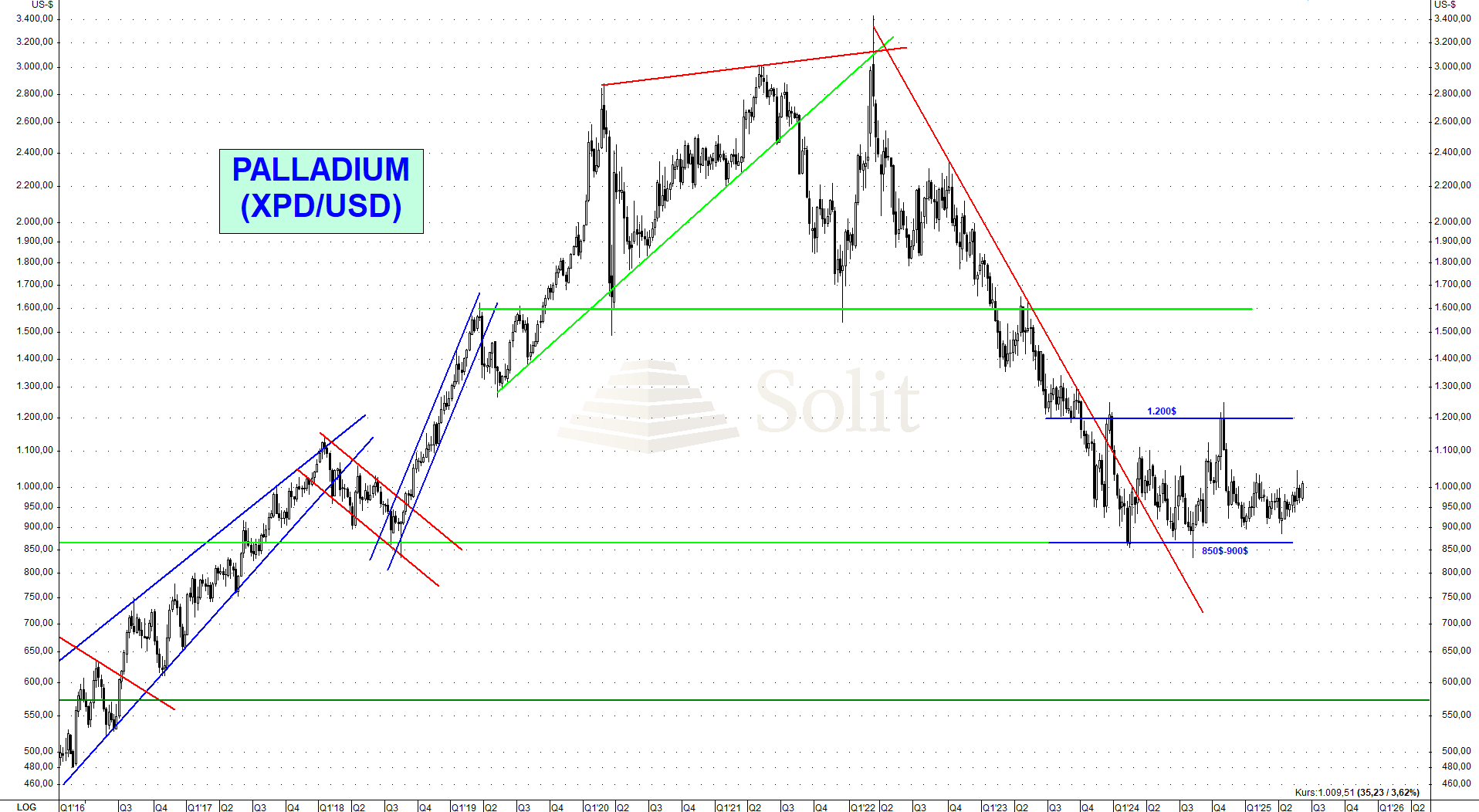 Zusätzlich stellt eine globale wirtschaftliche Abschwächung ein weiteres Risiko für den Palladiumpreis dar. Im Falle einer Rezession wäre ein kurzfristiger und markanter Rückgang unter die Unterstützungszone bei 850$ sehr wahrscheinlich. Die nächste technische Unterstützung befindet sich erst bei 570$. Auf diesem Niveau sehe ich aktuell eine attraktive Chance für einen kurz- bis mittelfristigen Einstieg in Palladium, wobei wir die Lage dort dann neu analysieren müssen.