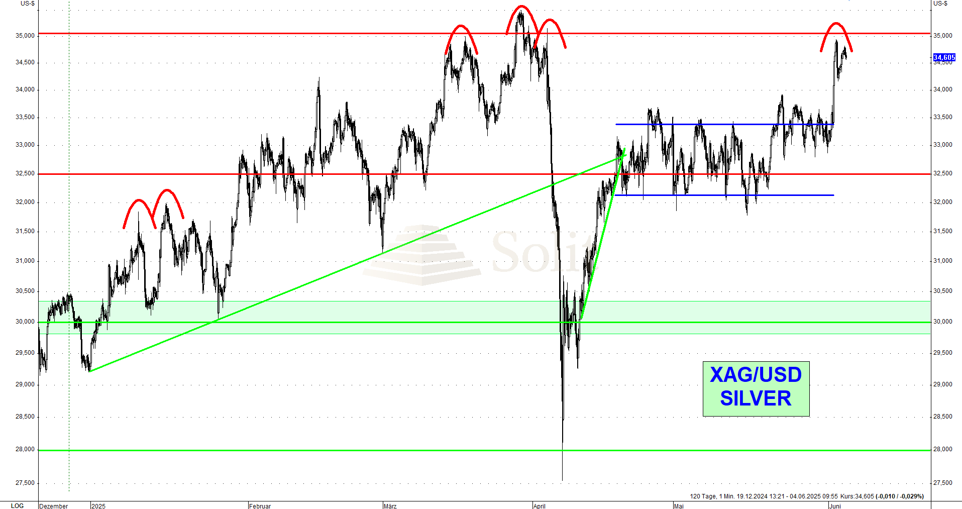 Zu Wochenbeginn beschuldigte US-Präsident Trump China, die Bedingungen eines vorläufigen Handelsabkommens verletzt zu haben, um bestehende Zölle rückgängig zu machen. China wies diese Vorwürfe zurück. In Reaktion darauf sprang der Goldpreis über seinen bestehenden Abwärtstrend bei 3.320 US-Dollar und stieg im Umfeld eines schwächeren US-Dollars zunächst bis auf 3.390 US-Dollar an. Dabei wurde eine potenzielle Fortsetzungsformation bullisch aufgelöst, was weitere spekulative Marktteilnehmer anziehen dürfte, solange der Aufwärtstrend intakt bleibt.