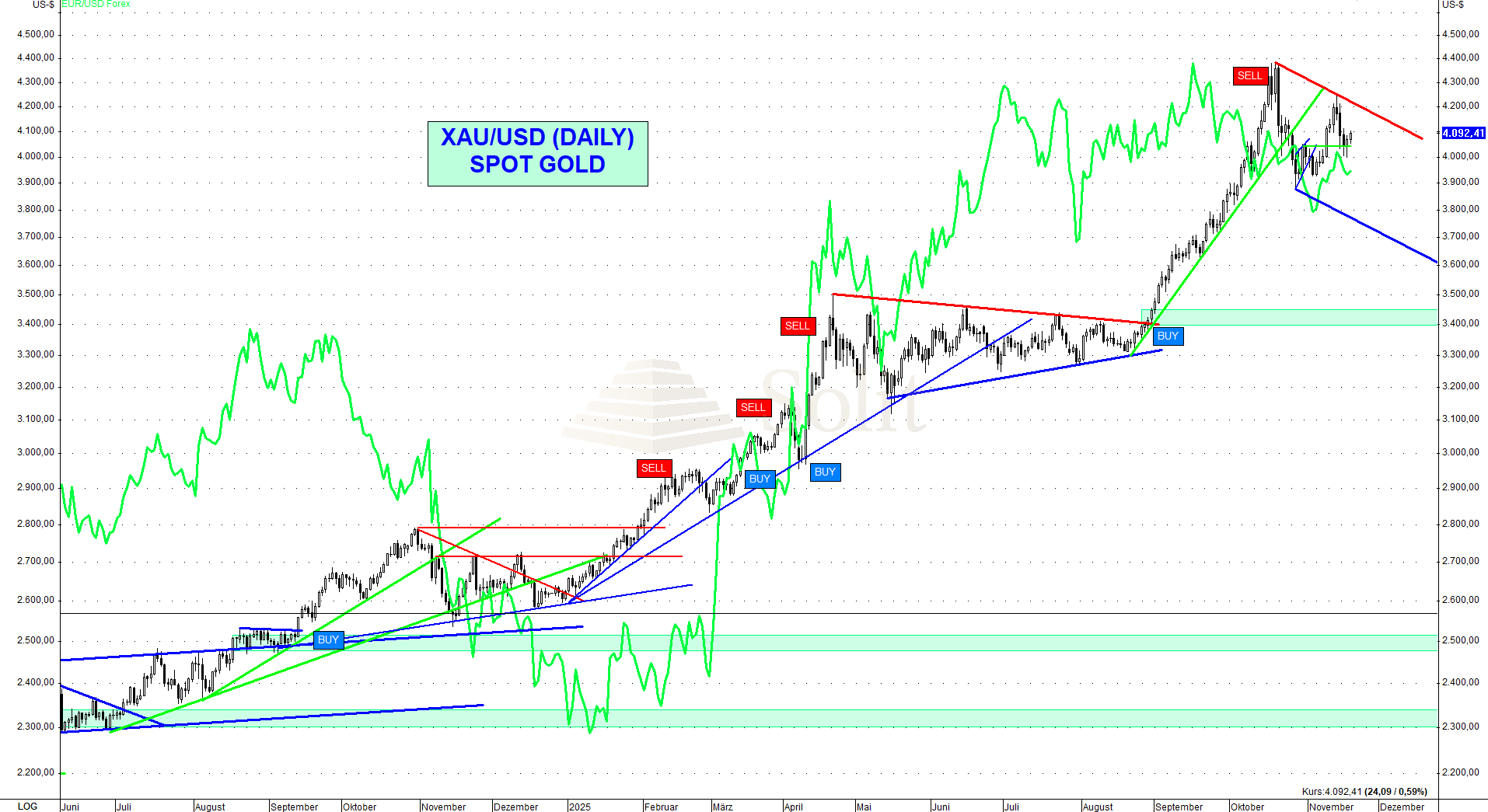 Kurzfristig versuchen wir im Trading weiter zu shorten, mit einem Ziel bei etwa 3.800 $ bis 3.750 $, wo wir im Daytrading alle Short-Positionen schließen würden. Bullisch würde das Chartbild erst wieder werden, wenn es dem Goldpreis gelingt, das Hoch der letzten Woche bei 4.250 $ zu überwinden. In diesem Fall dürfte das Allzeithoch bei 4.400 $ angelaufen werden, wo sich schließlich entscheidet, ob sich die Rallye weiter fortsetzt.