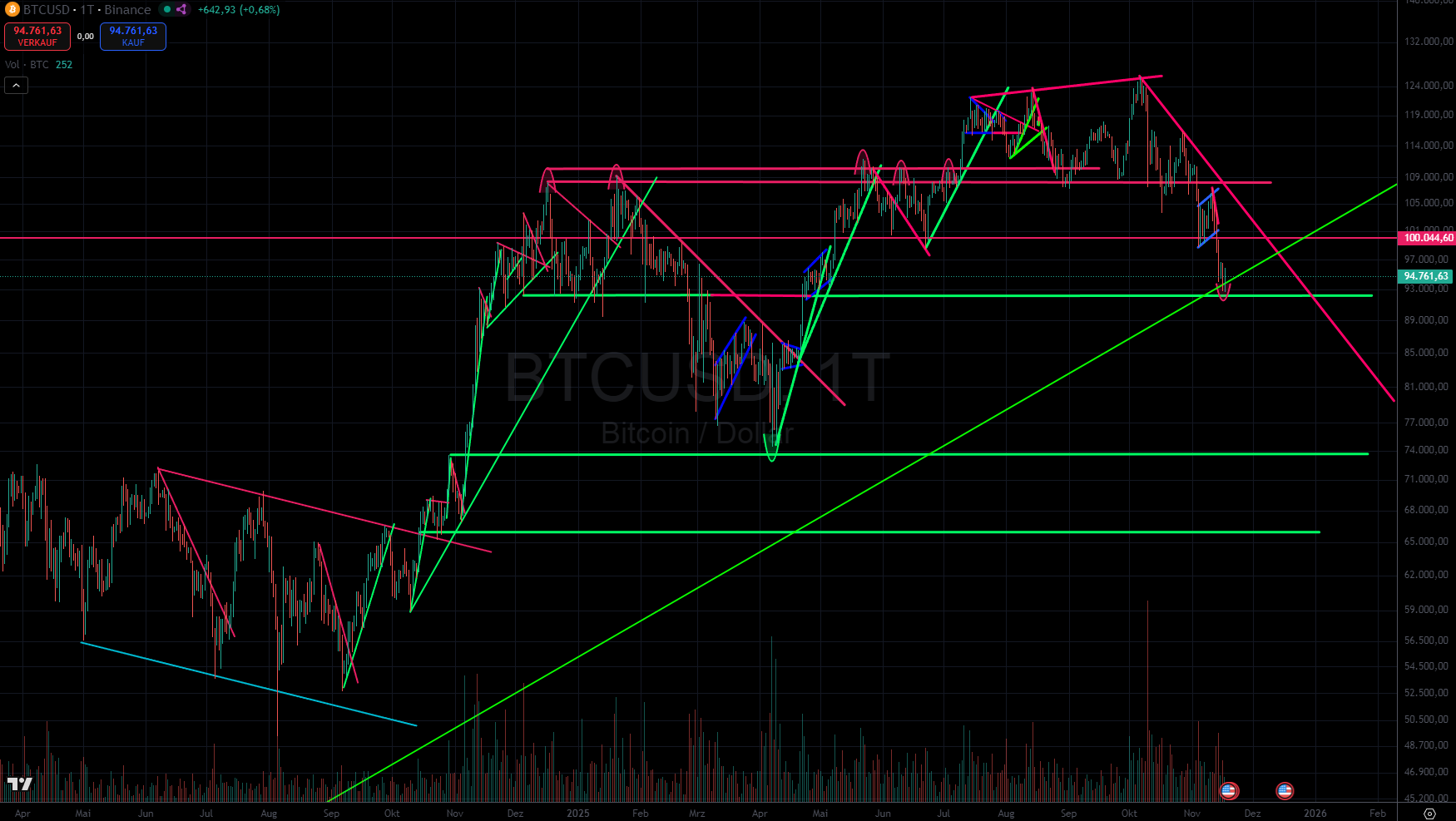 Technisch und marktpsychologisch betrachtet könnte der definitive Fall des Aufwärtstrends eine Kaskade aus Stop-Loss-Orders und Liquidationen gehebelter Positionen auslösen, was zu schnellen und starken Abverkäufen am Kryptomarkt führen würde, ähnlich dem Crash vom Oktober.