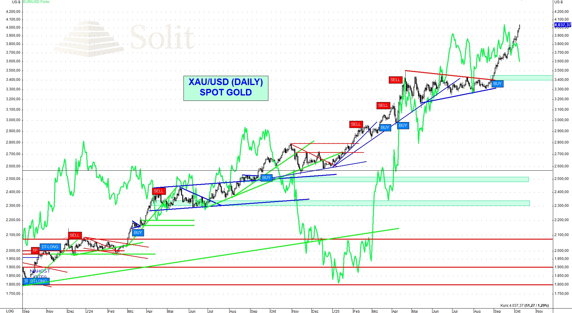 Von April bis Ende Oktober konsolidierte der Goldpreis in einer engen Handelsspanne und brach Ende August aus dieser dynamisch aus. Das deutliche Kaufsignal bot Raum für einen Preissprung von 300$ bis 400$, wobei es wahrscheinlich war, dass der Markt die psychologisch wichtige Marke von 4.000$ sehen und abarbeiten wollen würde. Nach diesem weiteren Preissprung um 17% binnen etwas mehr als einem Monat ist nun die Gefahr eine Korrektur hoch. Auch dieses Signal hatten wir im kostenpflichtigen Premium-Research, den sie auf www.blaschzokresearch.de abonnieren können, exakt gegeben, wie die Kauf- und Verkaufssignale im folgenden Chart belegen.