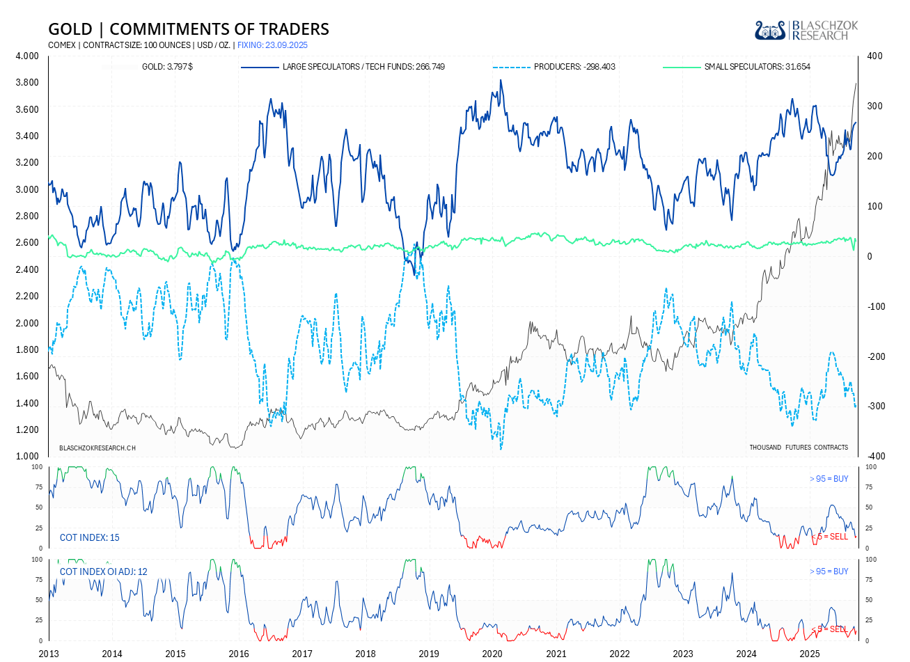 Die jüngste Aufwärtsbewegung wurde zunehmend durch spekulative Käufe angetrieben, da viele Anleger fürchten, einen weiteren Anstieg zu verpassen. Dieses Verhalten, auch bekannt als FOMO (Fear of Missing Out), ist typisch für deutlich fortgeschrittene Phasen einer Rallye. Nach einer Verdopplung des Goldpreises innerhalb von zwei Jahren richtet sich seit einigen Monaten auch die Aufmerksamkeit vieler Fondsmanager und Privatanleger auf den Gold-, Silber und Minenmarkt. Die Stimmung ist euphorisch, und viele Marktteilnehmer wollen noch einsteigen, aus Sorge, die Kurse könnten weiter in den Himmel klettern, was die Zuflüsse in ETF-Produkte in den letzten Monaten belegen.