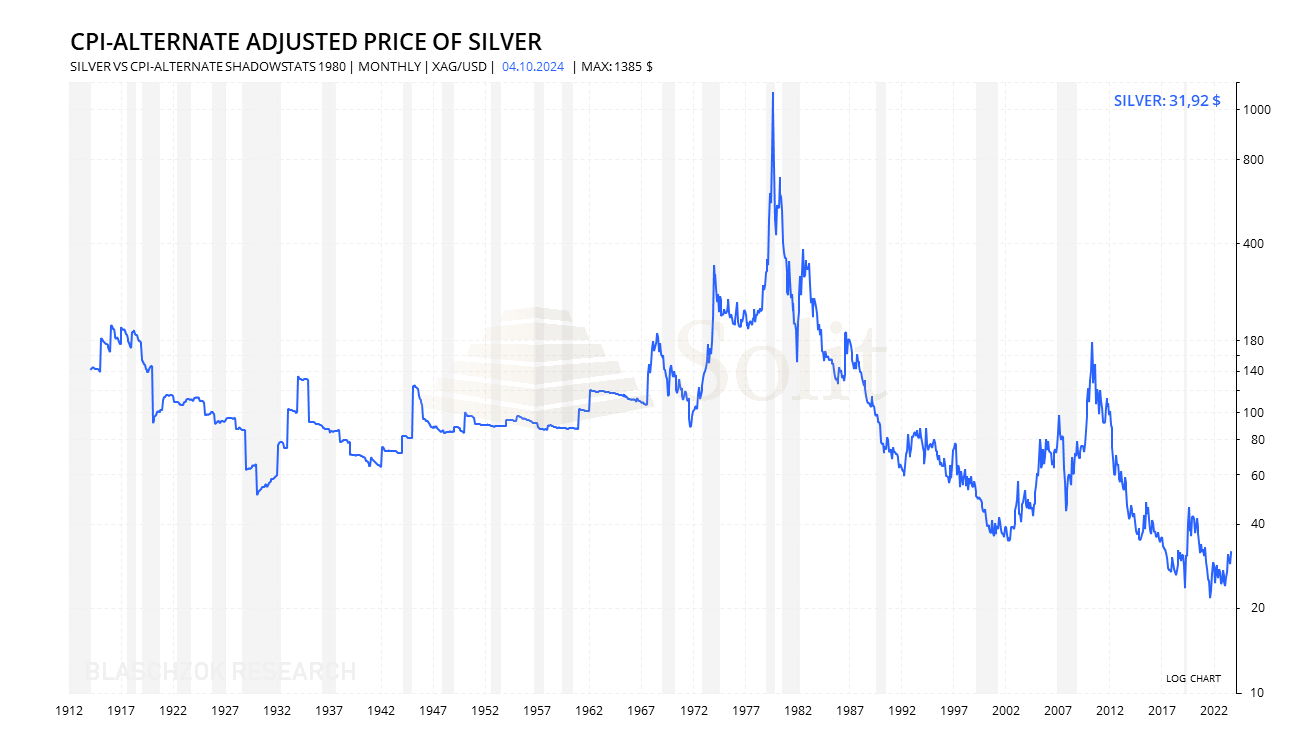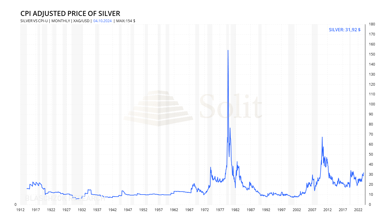 Der Goldpreis verbuchte in den letzten Monaten den stärksten Anstieg seit 1979 mit einem Plus von 46% und liegt mit über 2.640$ weiter über seinem nominalen Allzeithoch bei 850$ von 1980. Selbst inflationsbereinigt konnte der Goldpreis vorletzte Woche ein neues Allzeithoch erreichen, zumindest im Vergleich zur offiziell ausgewiesenen Inflationsrate. In der gleichen Zeit stieg der Silberpreis jedoch gerade einmal bis auf $33 an, was weit von dessen nominalen Allzeithoch bei $50 entfernt liegt. Nachdem wir uns im letzten Marktkommentar den Goldpreis inflationsbereinigt angesehen haben, wollen wir heute einen Blick auf den Silberpreis werfen.