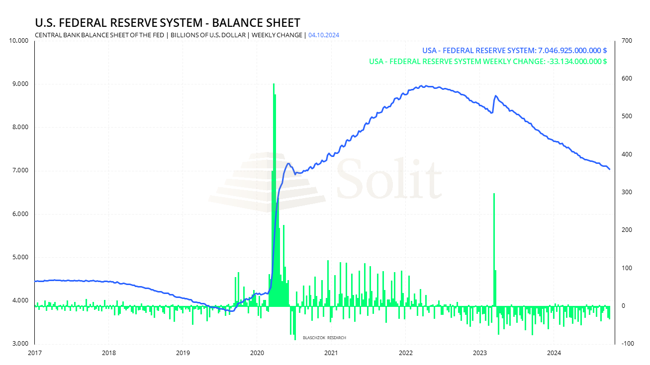 Bemerkenswert ist auch, dass die Bilanz der US-Notenbank mittlerweile auf das Niveau von Mitte 2020 geschrumpft ist, was bedeutet, dass die Hälfte der während der Corona-Lockdowns bereitgestellten Liquidität wieder aus dem Markt gezogen wurde. Vor diesem Hintergrund wirkt die historische Rallye des Goldpreises in diesem Jahr umso außergewöhnlicher, da sie sich in einem Umfeld abnehmender Liquidität vollzogen hat - eine Entwicklung, die in der Vergangenheit eher selten zu beobachten war. Dies deutet darauf hin, dass der Goldpreis durch andere Faktoren getrieben wurde, wie die Käufe der Zentralbanken, starke Nachfrage aus Asien und insbesondere dem smarten Geld, das bereits die nächste Krise während einer Stagflation auf uns zukommen sieht und auf neue Liquiditätsspritzen der Fed spekuliert.