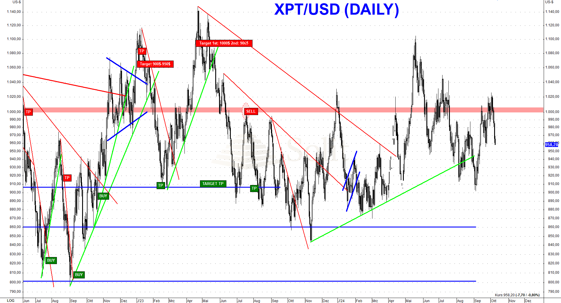 Kurzzeitige Aufwärtsbewegungen bieten gute Gelegenheiten, um Short-Positionen aufzubauen. Es ist durchaus möglich, dass Platin in den kommenden Monaten wieder in den Bereich von 800 US-Dollar fällt. Generell bleibt Platin unterhalb der 1.000 US-Dollar-Marke ein klarer Short-Kandidat, mit Kurszielen bei 860 US-Dollar oder sogar 800 US-Dollar. Über 1.000$ ist Platin aktuell kein Kauf, sondern man sollte darüber keine Position halten. Eine Korrektur auf 800 US-Dollar ist realistisch und hängt stark von der Entwicklung im Goldmarkt ab. Das nächste Ziel liegt bei der Unterstützung bei 860 US-Dollar.