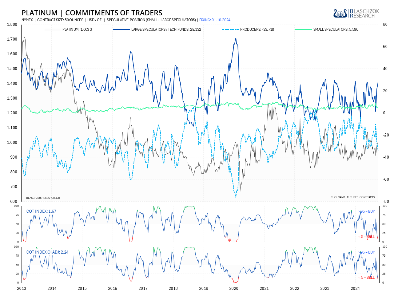 Der COT-Report wird immer freitags seitens der US-Terminmarktaufsicht (CFTC) veröffentlicht, wobei der Stichtag der Datenerhebung der Schlusskurs vom Dienstag ist. Die COT-Daten werden also immer mit einer Verzögerung von drei Tagen veröffentlicht. Premium Abonnenten von Blaschzok Research erhalten vor Handelsschluss am Freitag ein Blitzupdate mit Analysen zu Gold, Silber und Platin. Die COT-Daten ermöglichen einen Blick in die Zukunft, da sie einerseits ein Sentiment-Indikator sind und andererseits eine gute Einschätzung des Angebots und der Nachfrage am physischen Markt ermöglichen. Mit ihnen hat man einen Vorteil im Trading am Rohstoffmarkt.