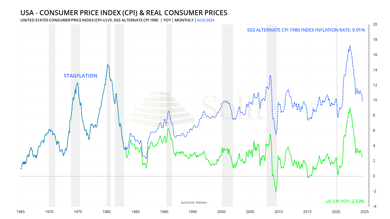 Der folgende Chart zeigt den Konsumentenpreisindex (CPI) der Vereinigten Staaten sowie eine alternative Berechnungsmethode des CPI (SGS Alternate CPI) nach den Standards von 1980. Die grüne Linie zeigt die offizielle Inflationsrate, die im August bei 2,5% lag und einer der Gründe war, warum die Fed zuletzt ihren Leitzins senkte. Die blaue gestrichelte Linie zeigt den SGS Alternate CPI, die den alten Berechnungsstandard, der bis 1980 verwandt wurde, fortsetzt. Letztere zeigt eine deutlich höhere Inflation von etwa 9,9%, was weit über der offiziell ausgewiesenen Teuerung liegt. Seit den 1990er Jahren zeigt die offizielle Inflationsrate eine wachsende Diskrepanz zum SGS Alternate CPI, die durch schrittweise methodische Anpassungen entstand, womit die Daten vermeintlich an eine sich wandelnde Wirtschaft angepasst werden sollten. Einige der wichtigsten Anpassungen sind Substitutionsverzerrungen, Hedonische Qualitätsanpassungen, ständige Veränderungen in der Gewichtung des Warenkorbs und die Nutzung einer Mietäquivalenz bei Wohnkosten anstatt der tatsächlichen Immobilienpreise.