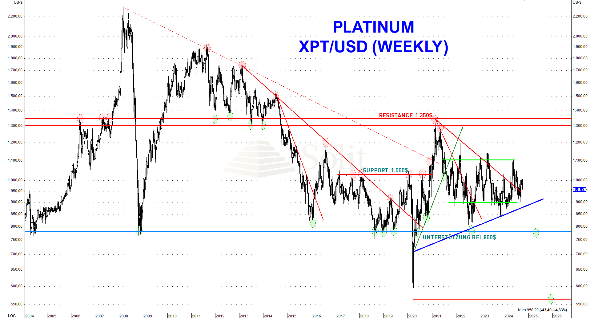 Im Bereich zwischen 800 und 500 US-Dollar dürfte der Platinpreis einen langfristigen Boden finden. Wir sehen Rücksetzer in diesen Bereich als attraktive mittel- bis langfristige Kaufgelegenheit. Auch für kurzfristig agierende Trader bietet sich in dieser Zone ein Setup mit einem vorteilhaften Chance-Risiko-Verhältnis.