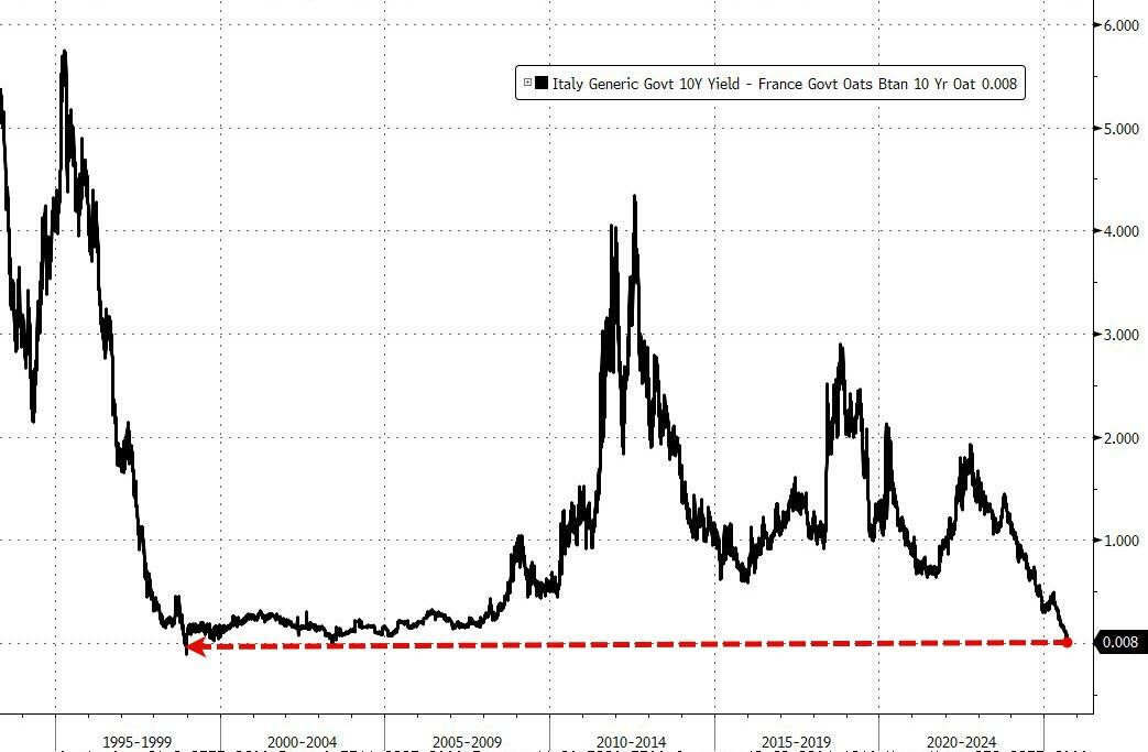 Der Zinsunterschied (Spread) zwischen französischen (OATs) und italienischen (BTPs) Staatsanleihen mit zehn Jahren Laufzeit ist auf einen historischen Tiefstand gefallen und die französischen Renditen (OATs) liegen erstmals über denen der italienischen (BTPs) liegen. Normalerweise verlangt der Markt von Italien als kredit- und fiskalpolitisch schwächerem Land einen ordentlichen Risikoaufschlag und somit höhere Renditen gegenüber Frankreich, weshalb der Spread in der Vergangenheit fast immer positiv war. Italien musste also höhere Zinsen zahlen als Frankreich, um Investoren für das höhere Risiko zu kompensieren.