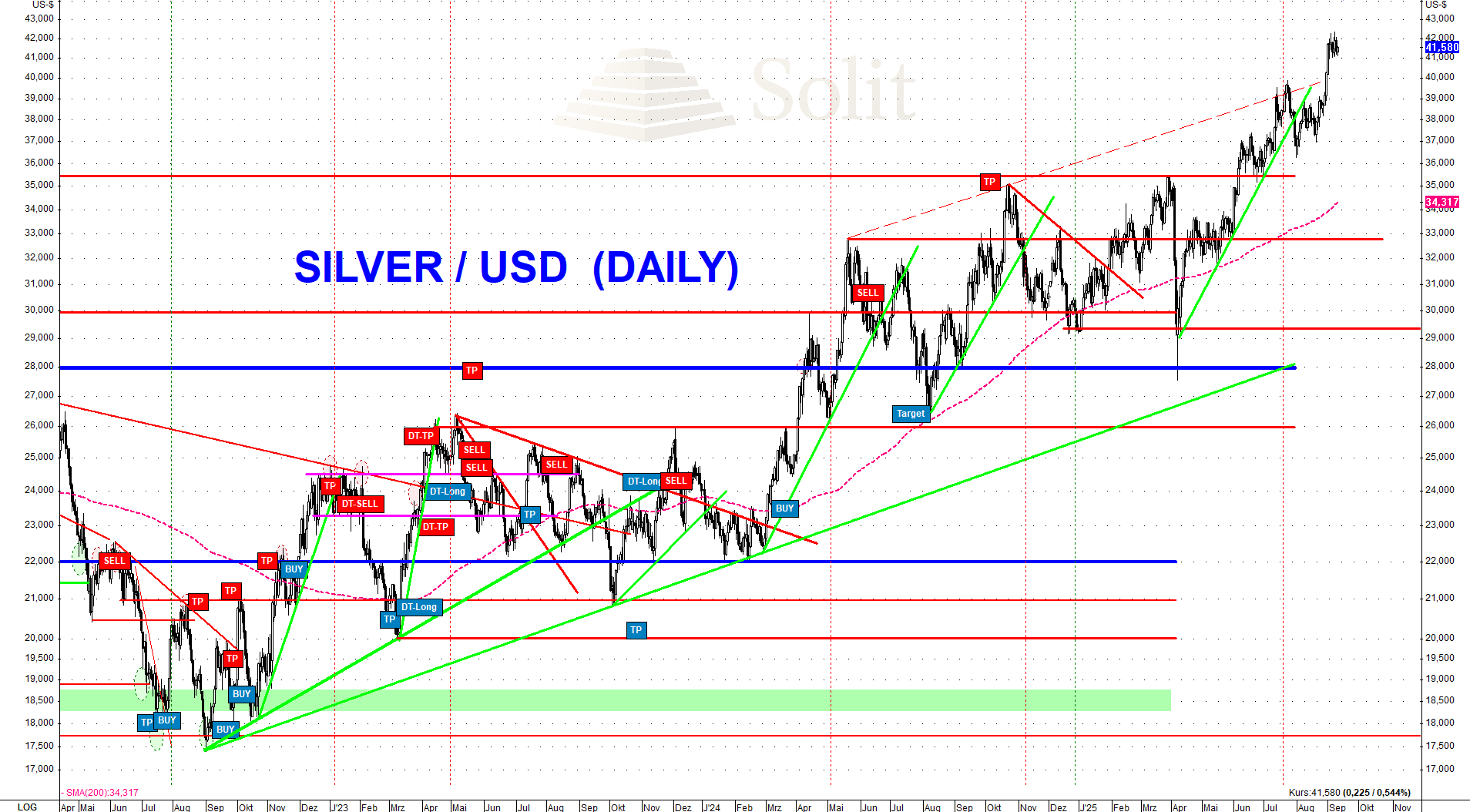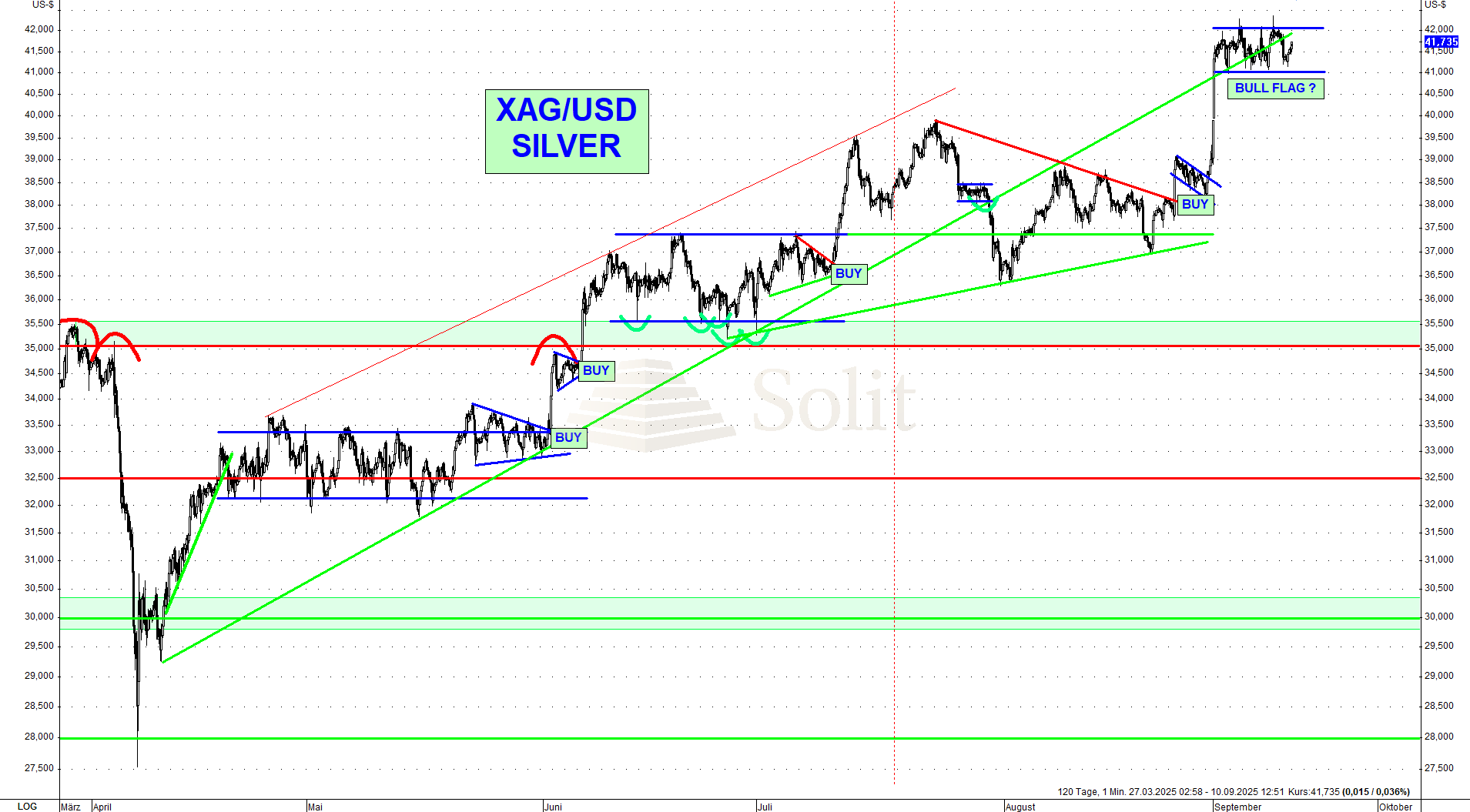 Ende August gelang dem Silberpreis der Ausbruch aus einem Abwärtstrend nach oben. Dabei wurde der Widerstand im Bereich von 38 $ überwunden, obwohl zuvor bereits ein Aufwärtstrend gebrochen war und eigentlich eine Korrektur zu erwarten gewesen wäre. Unterstützt wurde diese Bewegung maßgeblich durch die Eindeckungen der „Big 4“ an der COMEX, die eine historisch hohe Shortposition halten. Im Anschluss kam es zu einem impulsiven Anstieg bis auf 42 $ im Futures, den höchsten Stand seit 14 Jahren.