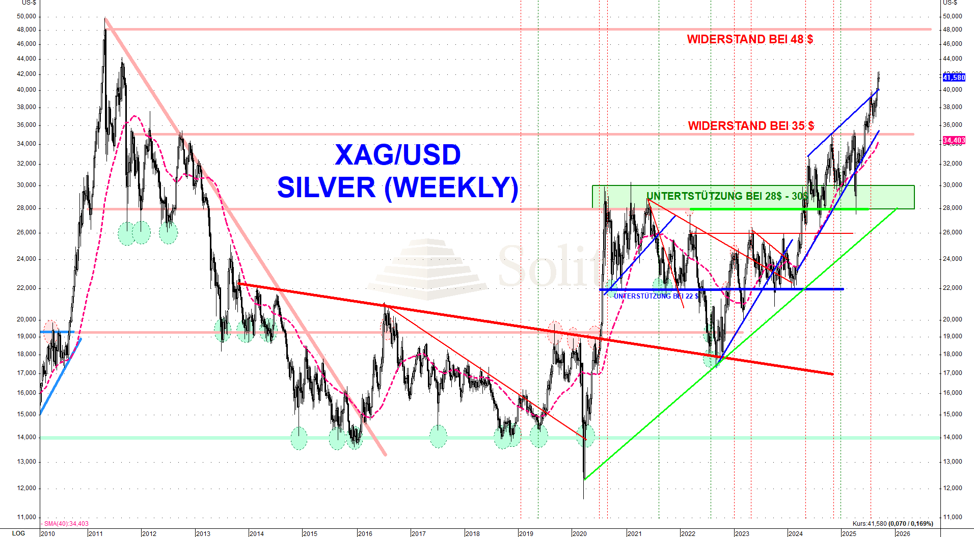 Die langfristige Entwicklung am Gold- und Silbermarkt bleibt weiterhin stark von einer möglichen Rückkehr zu einer lockeren Geldpolitik abhängig, beispielsweise als Reaktion auf eine Rezession, geopolitische Spannungen, den Einfluss der Trump-Administration oder eine neue Souveränitätskrise in der EU.